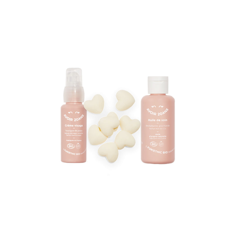 Crème visage "Avoir 20 Ans" et gel douche extra-doux au parfum marin 100% naturel. Soin riche en actifs défatiguants et éclatants. Gel douche enrichi en glycérine naturelle, nettoie et hydrate en profondeur. Formulation exemplaire respectueuse de l'Homme et de l'environnement.