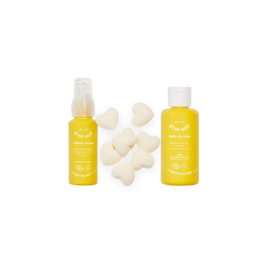 La crème matifiante limite les brillances. Le savon l’Acidulé 100% naturel accompagne la routine de l’ado, il apaise l’épiderme et possède des vertus purifiantes et calmantes. Issu de la saponification à froid, il est hydratant et apaisant.